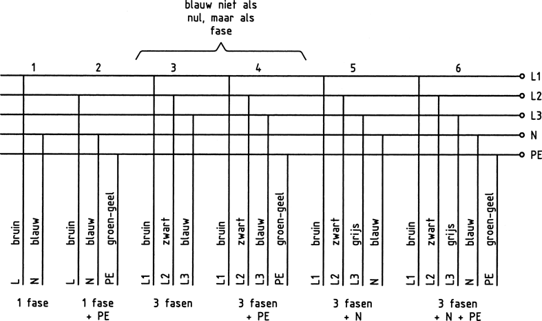 Figuur 8.51C - Voorbeelden van toepassing van aderkleuren in kabels en buigzame leidingen (zie bepaling 8.514.2.101)