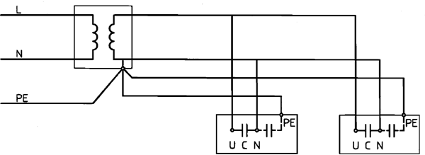 L1 en L2 of N zijn verbindingen aan de primaire zijde en PE is de verbinding tussen metalen gestellen en de hoofdaardrail of -klem bij beschermingsleidingen van toestellen van klasse I en functionele aarding van toestellen van klasse II.